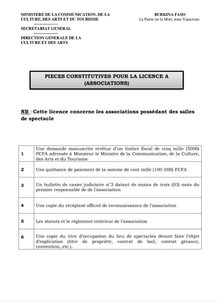 La demande de licence nécessite plusieurs pièces administratives. Les documents demandés varient selon la catégorie de licence et le statut de la structure qui dépose la demande. Les dossiers sont déposés auprès de la Direction générale de la culture et des arts. Cette procédure permet aux organisateurs d événements culturels d’exercer leurs activités dans le respect du cadre réglementaire en vigueur au Burkina Faso.